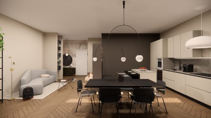Servizio di progettazione preliminare ed esecutiva in cantiere con cura per l’arredamento d’interni, sviluppo di planimetrie, modellazioni 3D, render fotorealistici, suggerimenti per colori, decorazioni ed elementi di arredo.